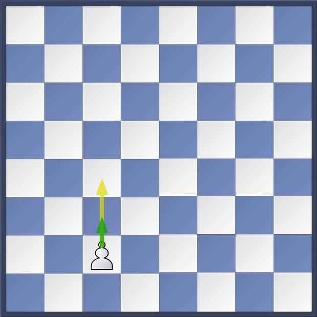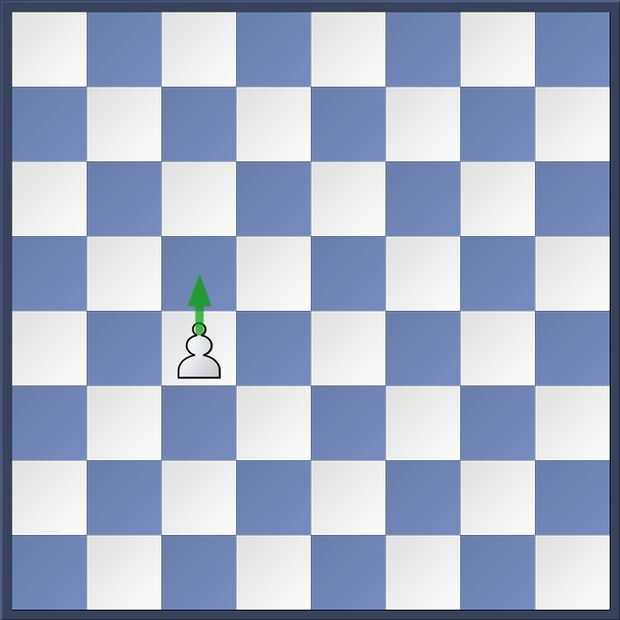 Peones son probablemente el más difícil de aprender debido a una serie de reglas especiales que les sean aplicables. Peones de captura con un movimiento diferente que se mueven en circunstancias normales y vamos a ver esto en los siguientes pasos. Peones mueven una casilla hacia delante a la vez, como se ve en el primer diagrama. Las plazas que los peones se mueven a no deben ser ocupadas por cualquier otra pieza en el tablero (a menos que está capturando esa pieza como se muestra en el siguiente paso).