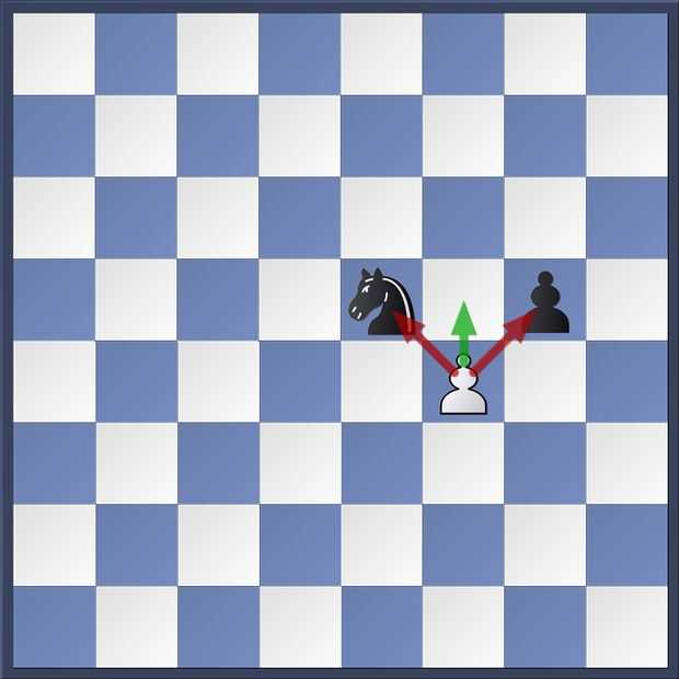 Peones de captura moviendo un cuadrado diagonalmente al tomar una pieza enemiga o peón que ocupa esa plaza. En el diagrama anterior, el peón puede capturar el caballero o el otro peón. Este Peón blanco puede mover una casilla hacia adelante. Tenga en cuenta que no pueden capturar peones por avanzar.