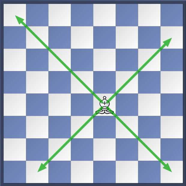 El obispo es capaz de mover en diagonal dada a lo largo de cualquier número de casillas desocupadas. Esto significa que si hay alguna pieza en el camino del obispo, no se puede mover más allá de esa pieza.
