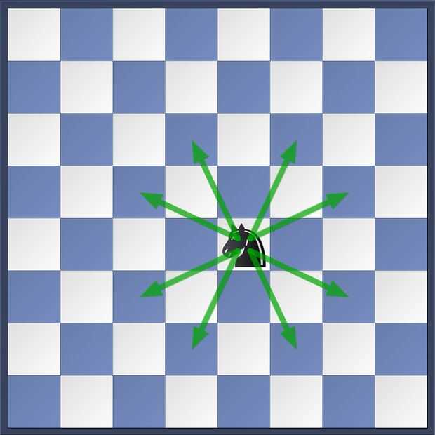 Esto es donde el ajedrez se vuelve un poco más complicado. Primero, el caballero es la única pieza que puede saltar sobre otras piezas. En segundo lugar, tiene un movimiento inusual. El caballero comienza su dos cuadros de arriba, abajo, izquierda, o derecha y acabados moviendo una casilla en un ángulo recto. Usted también puede pensar de él como mover pulg. cuadrada uno cualquiera de estos puntos cardinales y luego diagonal pulgadas cuadrados uno la misma dirección.