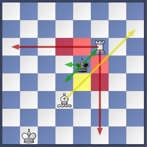 En el diagrama anterior, el rey puede moverse solamente tres casillas aquí (uno de ellos es capturar la torre). El obispo blanco y Torre atacan muchos de los otros cuadrados. Recuerde que un rey no puede moverse a una casilla atacada o capturar una pieza que es defendida por otra pieza.