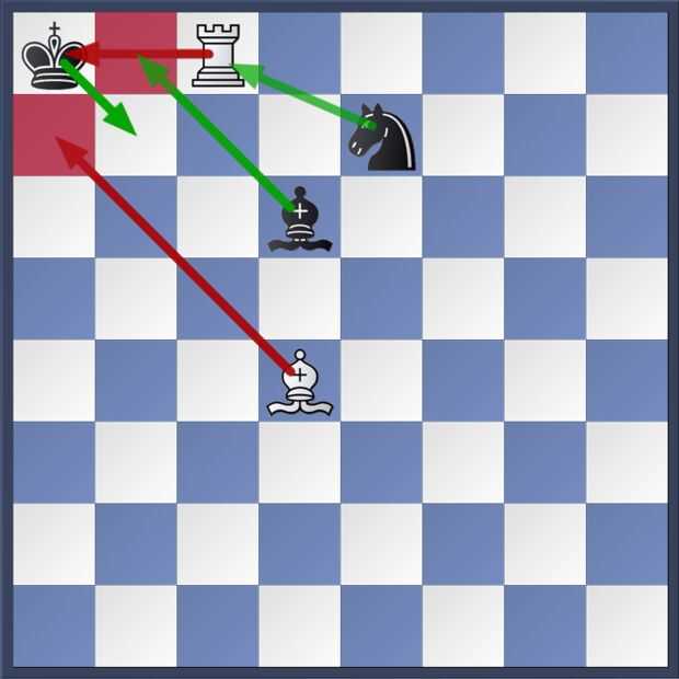 Una manera fácil de recordarlo es recordar ABC (lejos, bloque, captura). En el diagrama, el rey puede mover a una casilla, bloquear el ataque de la torre con el obispo y capturar la torre con el caballero.
