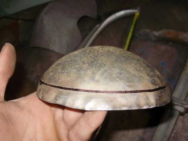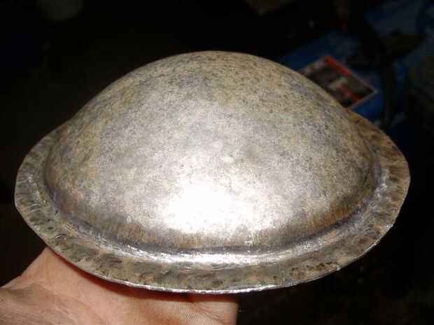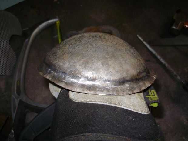 Una vez tuve mi juego compuesto por limpiar la brida era tan simple como que la brida contra la parte superior de la estaca y haciendo unas pasadas alrededor de él con la cara plana del martillo para hacer la brida toda plana. Entonces para afilarlo hice unos pasos más, martillando suavemente el pliegue sí mismo contra la esquina de la estaca con mi martillo dishing. Cualquier martillo con una cara curva funciona para esto, pero el martillo dishing era lo que tenía.