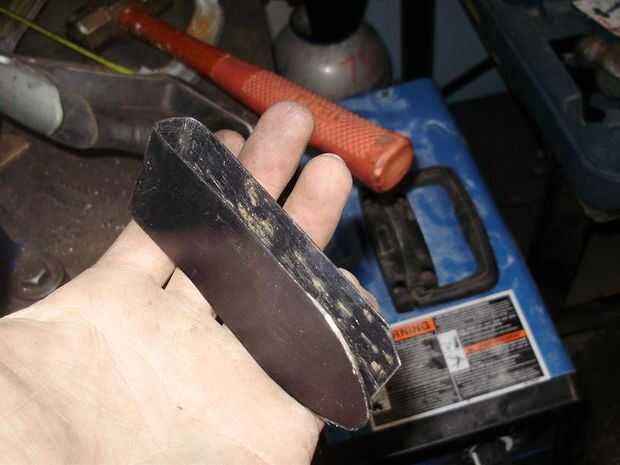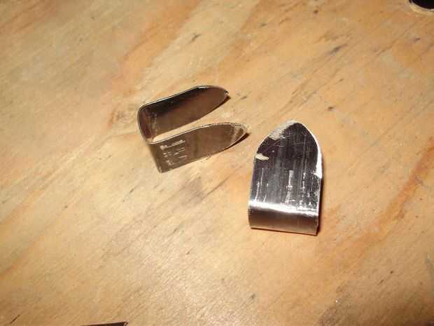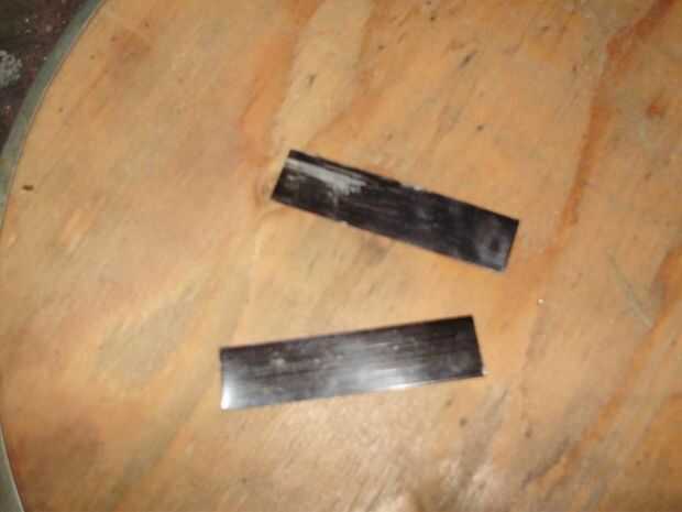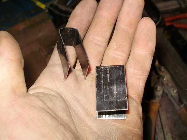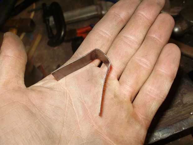Construí mi abrazaderas de paleta de bandas, los 2 más grandes de 1 1/4", los 2 pequeños de 3/8". Para formarlos robaban hasta un pedazo de la acción de la barra de tamaño adecuado para usar como un golpe de tipo y utiliza las mordazas de la prensa como un dado.