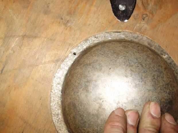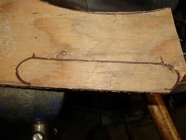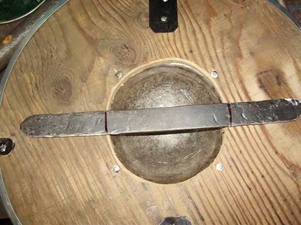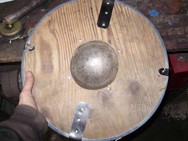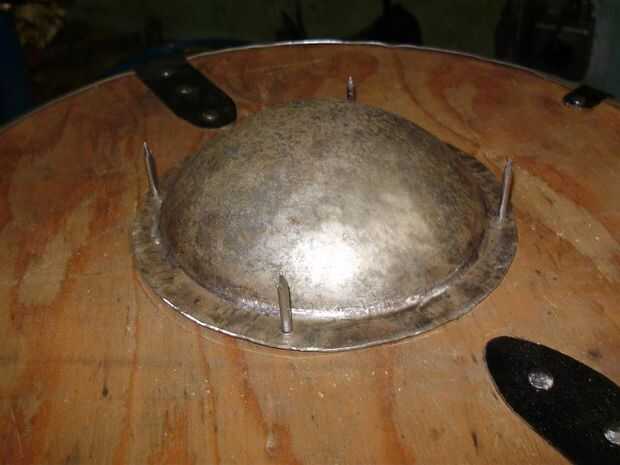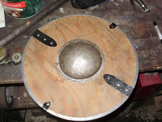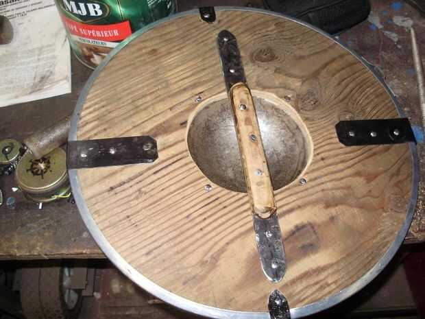 A continuación trazó la zona de agarre en alguna madera de desecho, córtelo hacia fuera y completa todas las superficies externas. Entonces había fijada en la barra, unos agujeros perforados y había clavado en el lugar. Una vez que su puño está montado sólo remache en el cuerpo de la rodela y su buena para ir.