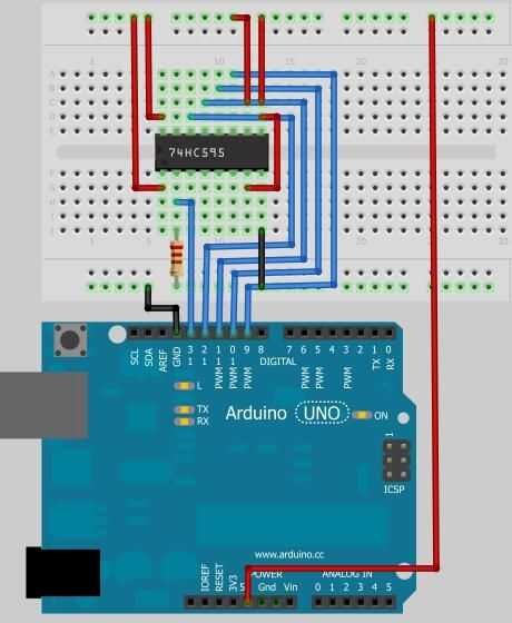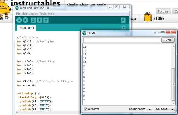 Primero tenemos que hacer las conexiones adecuadas entre la IC y el Arduino. Esto es todo digital, y el Arduino solo tiene 12 pines disponibles para este tipo de cosas (los pines 0 y 1 están reservados para la comunicación serial). Utilizar la imagen adjunta para hacer las conexiones. PIN 13 se utiliza para el pulso de reloj para que el Arduino LED parpadea cuando se envía un impulso. Una vez que has hecho las conexiones, grabar la secuencia de comandos adjunta a continuación a Arduino, se anota el código. Una vez que el Arduino está parpadeando, abra al Serial Monitor y debe verlo contando de 0 a 15 una y otra vez!