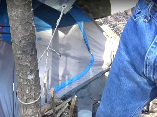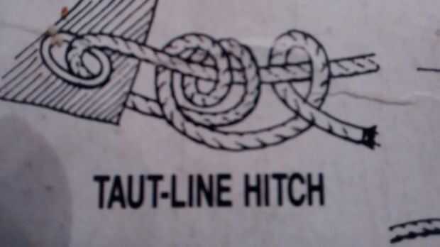 Tener una mirada cercana en el nudo antes de intentar aprender. Vemos en la imagen dos tensa línea de enganche, uno cerca de la lona y otra conexión de la lona al árbol. A desatar el uno más cercano al árbol y lo rehaga.