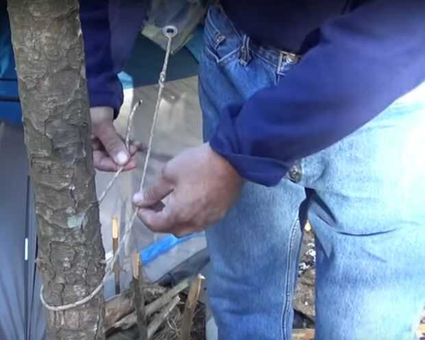 Enrolle el cable alrededor del árbol y verás una parte del cable es recta y el otro extremo es el que puede girar alrededor de la cuerda recta. Tómelo lento y deje el ojo siga el cable que forma el nudo de las fotos y no es confuso, será sencillo. Probablemente le ayudará si usted mira el vídeo que hice, (estas fotos son capturas de pantalla de este video) y es fácil de aprender la tensa línea del enganche si puede verlo atado mientras te digo lo que estoy haciendo.
