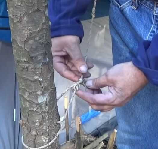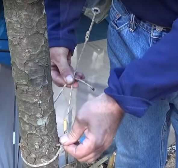 Ahora enrolle el cable alrededor del cable recto otra vez, pero esta vez lo hace en el lado opuesto de donde se cruzan los cables. Esto le dará dos lazos cerca del árbol y un lazo más cercano a la lona. Luego apriete todo para arriba. (No fue fácil la primera vez que ató sus cordones pero creo que eres bastante bueno en esto ahora, así que sea paciente y práctica la tensa línea de enganche y verás lo fácil que es realmente).