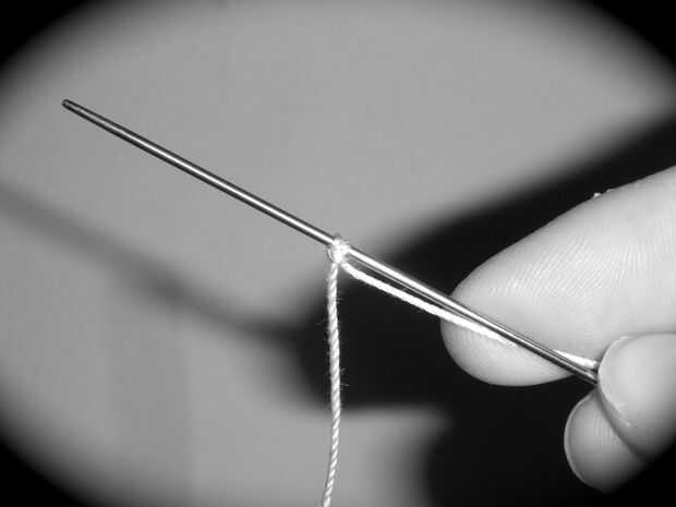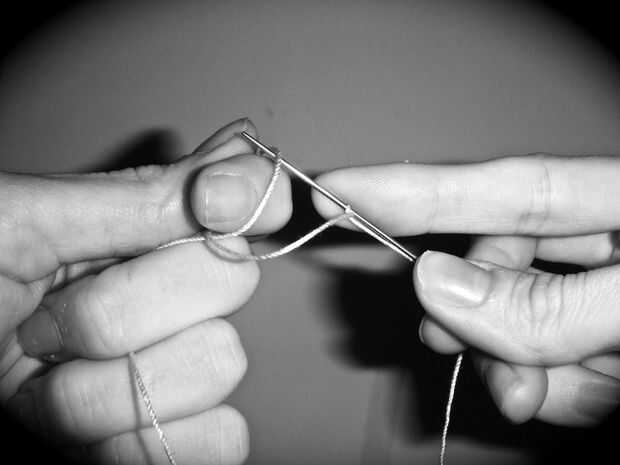 Para la segunda mitad de la ds, hacemos lo contrario. Envuelva el hilo alrededor de su dedo índice a la izquierda, deslice la aguja bajo el hilo hacia la punta de su dedo. Deslice el lazo junto a la primera lazada y apriete.