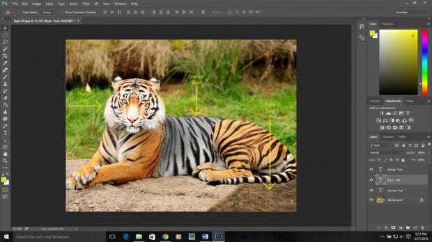 La quemadura, dodge y herramientas de esponja son herramientas como pincel que manipulan la intensidad de luz y color. La herramienta puede hacer áreas en su foto más oscura. La herramienta dodge puede hacerlos más ligeros. La herramienta esponja puede saturar o desaturar el color en el área que pinta con él. Estas son todas herramientas muy útil para retoques de foto.