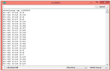 Una vez cargado el código, el resultado puede verse en el monitor serial. Cuando el sensor se mantiene plano, sin ninguna rotación, obtenemos los siguientes valores que se muestra arriba.