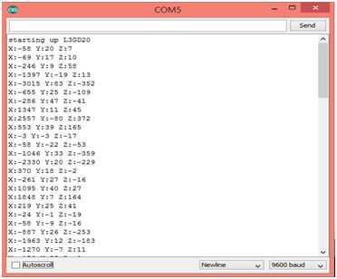Cuando el sensor se gira sobre el eje x en dirección, los valores de x será negativo y mayor, y el LED verde se encenderá. Cuando el sensor se gira sobre el eje x en sentido contrario, los valores de x serán positivas y superiores, y el LED amarillo se enciende.