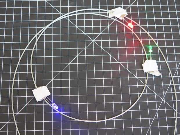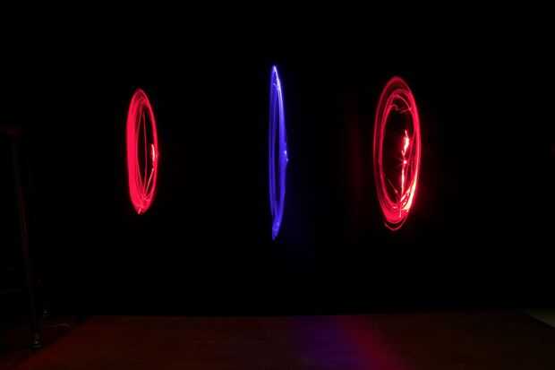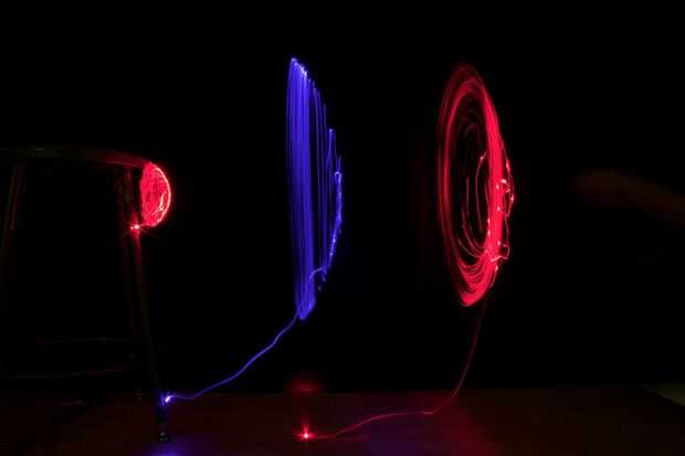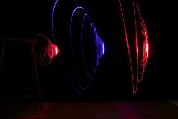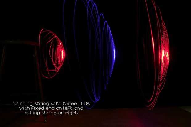 Mi primer experimento en la foto fue centrifugado LEDs sobre una cuerda y luego tire de la cadena a la derecha. puedes ver las diferentes amplitudes iniciales de su órbita y entonces ellos estrechamiento como se tiran a la derecha. Esto es una demostración aseada de la relación entre movimiento y tensión y es lo que da de cuerdas de la guitarra los tonos ajustables.