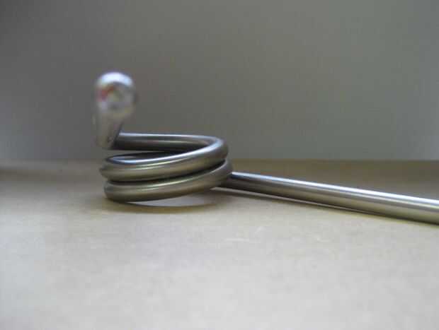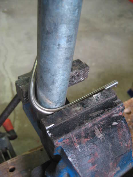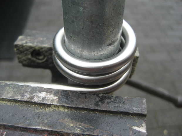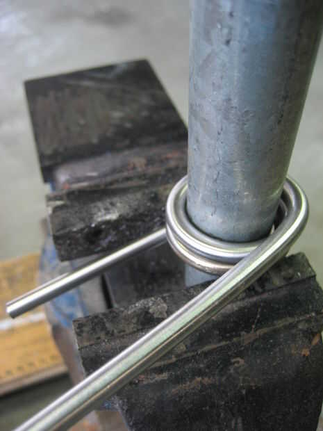 Medida 9 cm en el eje. Este es el punto donde comienza el rizo. Bloquear el eje de acero dentro de la mordaza de ángulo recto con el tubo. Girar el eje acero dos veces y media alrededor del tubo para crear un rizo bonito. Este enrollamiento actuará como un resorte. Mida 9 cm desde el extremo del rizo y corte el resto de con una sierra para metales.