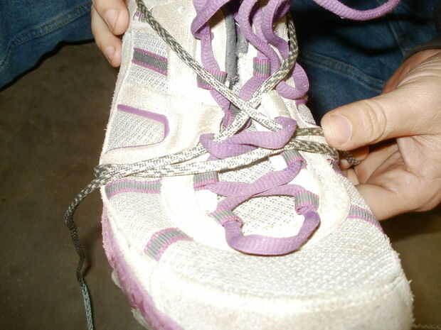 Enrolle el cable alrededor de la parte posterior de la zapata y rosca lanzó los cordones para mantenerlo apretado y caiga fuera de la zapata.