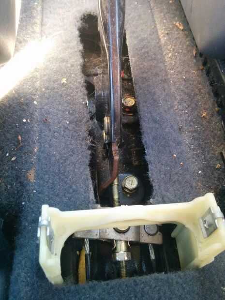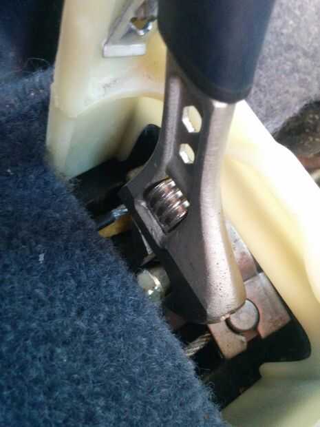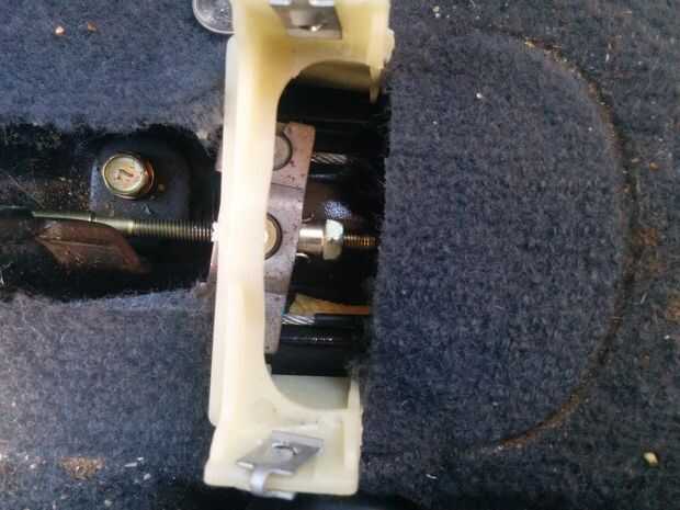 Una vez que haya quitado la tapa de la consola de centro entre los asientos, es fácil acceder al cable de freno de mano y su tuerca.