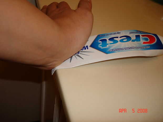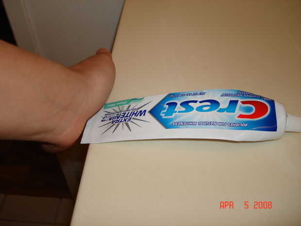 Mayoría de las veces tienes pasta de dientes en el final, sólo tiene que utilizar la esquina de su fregadero (dado tienen un borde plano, también puede una tabla) y la palma de tú mano para aplanar el tubo hasta que haya suficiente cantidad de una punta plana para agarrar.