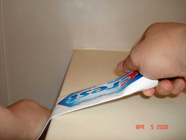 Esta es la parte fácil. Sólo Deslice el tubo de pasta de dientes en el borde del fregadero mientras se aplica una fuerza hacia el fregadero (Imagínense que están intentando extraer el tubo de pasta de dientes con el borde del fregadero!).