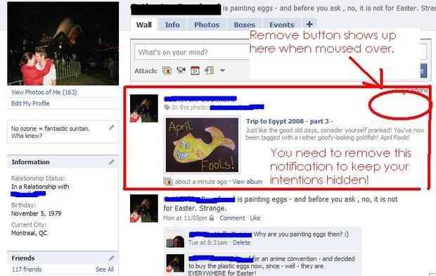 Guardar los cambios para el álbum y acabado de etiquetar a todo el mundo, volver a la página de tu perfil y borrar las noticias sobre la nueva adición a su álbum de fotos. Esto también debe eliminar cualquier evidencia de las principales noticias que tienes un publicada un pez a tu perfil. La última cosa que quieres hacer después de pasar por el esfuerzo de ocultar los peces, es gritar a toda la comunidad de Facebook!