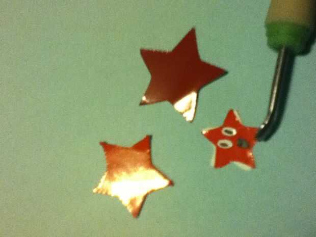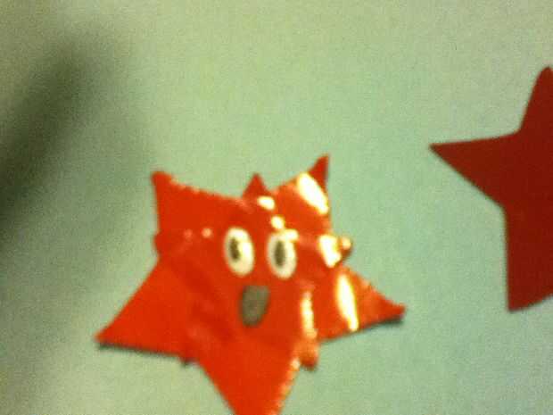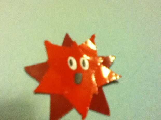 Hice Spikey haciendo tres estrellas de tamaños diferentes en cartulina de vinilo con una etiqueta engomada de la copia de seguridad. Empecé por poner los ojos y la boca en la estrella más pequeña para su cara. Entonces las tres estrellas fueron escalonadas en uno al otro a darle una mirada puntiaguda. La estrella de la parte inferior es el más grande y la estrella superior es el más pequeño con la cara.
