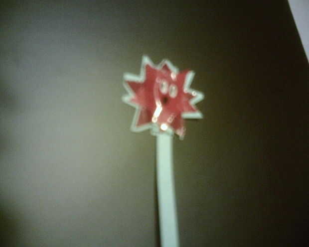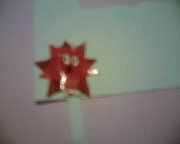 A continuación os pongo Spikey en la varita y en la parte de atrás que puse un pedazo cuadrado de cartulina que corté a Spikeys forma.