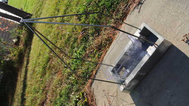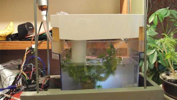 Nuestro sistema está construido alrededor de un filtro brita. El fondo apoyará el pescado y encima pondremos las plantas. Hemos construido un marco alrededor del filtro para conectar cables y luces. La parte inferior está hecha de madera contrachapada, y atamos cuatro postes en los agujeros de taladro en las esquinas de la 2 x 4 que se unen por encima del filtro para colgar las luces de. En la parte inferior del marco del dejamos un espacio abierto a utilizar para el almacenamiento de alambre para que tengamos un lugar para los tableros de microcontrolador y tanto ir.