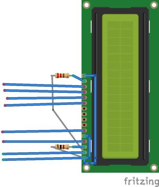 - Resistencia de resistencia de 1K entre VEE (también etiquetado como V0 a veces) y la tierra