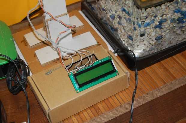 AquaFeeder se empiece a abrir la tapa, mientras que la pantalla LCD muestra "Apertura de la tapa". Entonces el otro motor de servo girará y tirón un poco y luego volver a su posición inicial. Después de eso, se cerrará la tapa. Compruebe las conexiones si uno o ambos servos no funciona!