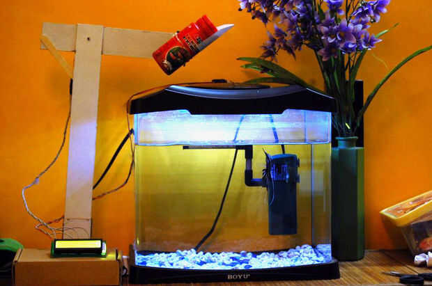- Mejor automatización: AquaFeeder 1.0 era una máquina automatizada, pero había muchos problemas. Por ejemplo, 1 de cada 8 veces que dejaría el programa de alimentación y los peces no ser alimentados, tal vez debido a la pérdida de energía o comportamiento inusual del motor servo. También, no podía averiguar si había perdido la alimentación de los peces, o si estaba apagado durante el tiempo de alimentación.