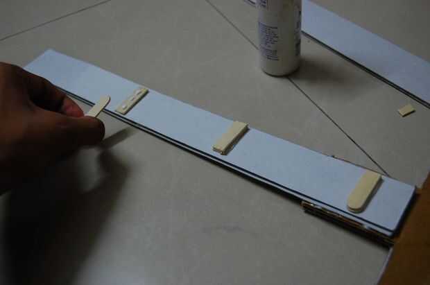 Antes de fijar la pluma a la torre, pegar algunas piezas de palitos de helado en una columna (de la torre) como se muestra en la foto 3 de arriba. La idea es que cuando nos pegan las dos columnas de la torre, debe ser un espacio en medio para caber en la horca.