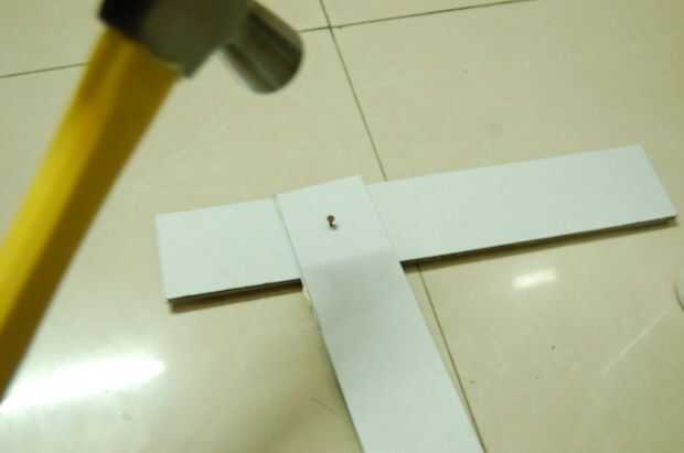 - Ahora, inserte un clavo para sujetar la pluma a la torre. La horca será capaz de girar alrededor de la uña, para que usted puede ajustar el ángulo entre la torre y pluma más adelante.