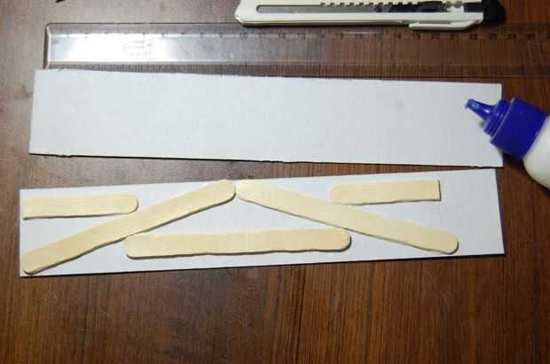- Al igual que en el paso 3, sandwich helado palillos entre las dos piezas de mountboard con pegamento PVA para terminar la horca...