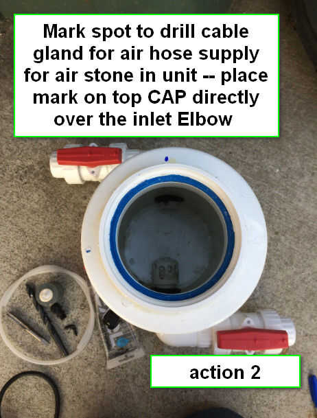 Marque punto para perforar la glándula de cable de suministro de manguera de aire para el aire de piedra en unidad--lugar marca en la tapa directamente sobre la entrada de codo. Como se muestra en acción foto - 3 anterior.
