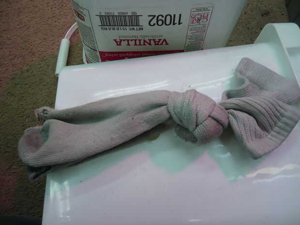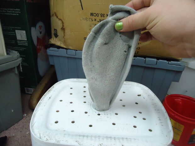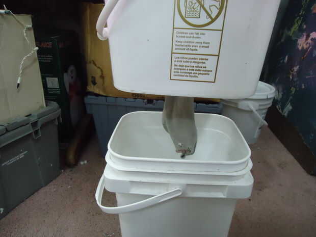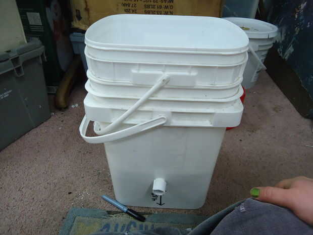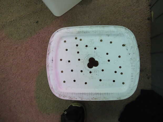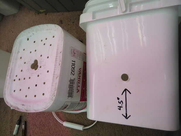en primer lugar, la altura 4 y medio pulgadas de la parte inferior de su cubo más grande y con su 1/2" agujero Sierra, cortar un agujero en el lado ancho de su cubo, como se muestra en la imagen siguiente se utiliza el grifo 1/2" para pasar el agujero sólo han cortado, voltee el cubo y repetir en el lado opuesto. Utilice cinta de fontaneros para recubrir las roscas en los adaptadores macho (generosamente, añado) y en el lado de la canastilla, desde el exterior. (fig.2) la cinta de plomería debe garantizar que no habrá fugas. Ahora, para el cubo más pequeño, voltee boca abajo y porciones de 3/8 agujeros por todo el fondo de la cubeta, (ayuda con areation) con un orificio grande en el centro, que será donde la mecha se irrumpirán en el agua abajo del taladro. Ahora, toma tu par de calcetines y un nudo, como cerca de la cima como sea posible, (fig.3) y los alimenta por la parte inferior del cubo más pequeño como se muestra en la fig.4. Fig 5 muestra vista interior de profunda cubo adaptadores macho una vez estén en su lugar. todo lo que queda ahora, es poner el cubo más pequeño en el más grande, como se muestra en la fig. 6 y 7. Pintamos Nuestro sistema 4 cubo verde, la mejor pintura que hemos encontrado para este trabajo es Krylon Fusion, ya que se adhiere al plástico excepcionalmente bien. Todo lo que queda es aplomar el cubo o cubos en tu sistema de acuaponia, rellenar con buena tierra o compost y el método de hacer tan sólo está limitado por su imaginación, en la siguiente página te mostraré un par de fotos de cómo logra esto. Tenga en cuenta, que el tomate se inicia en la fotografía son la exacta misma edad y se han cultivado bajo una tienda regular de T-8 luz con bombillas de luz del día, la única diferencia entre los dos, es que la 2 º foto es de una planta que ha sido en el cubo para aproximadamente una semana.