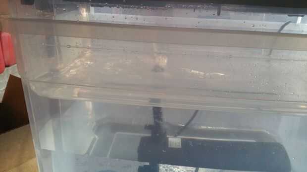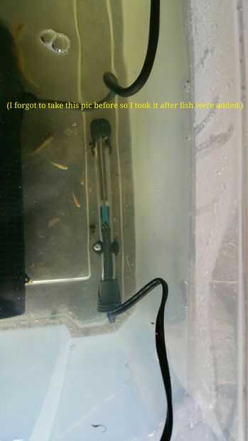 Llene el recipiente de un galón 27 medio con agua. (Si sólo tiene agua, comprar agua purificada en el supermercado). Quitar el inyector de la fuente para la fuente no jet o aerosol de agua por todas partes. Quiere que salga, no disparar hacia fuera. Enchufe la bomba para asegurarse de que todo está funcionando. Desenchufe la bomba hasta más tarde. Calentador de lugar, si usted decide tener uno, en la parte inferior del recipiente de un galón 27 y pegar en el termómetro en el lado opuesto el calentador está en (Foto 2). Tilapia (Nilo blanco) estoy agregando a este sistema así que poner un calentador. Goldfish o koi no requiere uno, pero es una buena idea tener una estabilidad de temperatura.