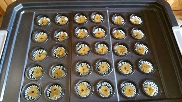 Utilizando taladro y agujero accesorio de sierra, corte 30 agujeros en la tapa. 2 filas por el panel. Lugar 30 ollas en los agujeros (Foto 1). Seguimiento con poner un trozo de lana de roca en cada maceta (Foto 2). Con cuidado poner tapa a un lado. Lo necesitará más adelante.
