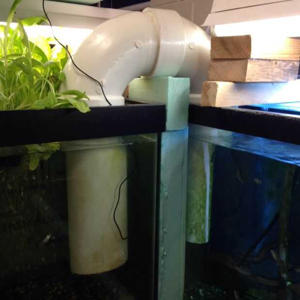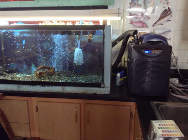 Tengo dos tanques de 55 galones que se unen mediante un puente de tanque (de 4" PVC). El puente del tanque se llena de agua y los peces tienen la habilidad de nadar de un tanque a otro. Un interesante puente de tanque sería hecho de acrílico transparente o de vidrio para que se podían ver los peces nadando entre los tanques, pero mi objetivo principal era menos estética y más acerca de la función. Sólo tengo un enfriador (la parte más costosa de la instalación). Supuse que si el pez tenía más espacio y menos competencia tendría como resultado una tasa de supervivencia mayor. Hasta ahora, bien. Para tener dos tanques y un enfriador que necesitaba dividir la línea de retorno desde el refrigerador para que se vacíe en ambos tanques. También debían a granel hasta el aislamiento alrededor del tanque para ayudar a prolongar la vida de la enfriadora. Los alumnos fueron los encargados de la construcción entera bajo estrecha supervisión. El aislamiento grueso de dos pulgadas es caro por lo que los estudiantes debían medir dos veces antes de realizar cualquier corte. Hay un bio filtro en el tanque a la derecha y la bomba que tira agua con el refrigerador es también en ese tanque. El tanque de la izquierda tiene un filtro de carbón. Cada tanque tiene es la piedra del propio aire.