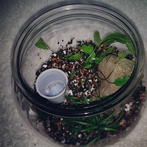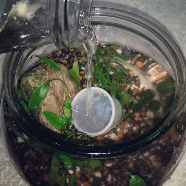 Verter agua en el recipiente a rápido va a destruir todo su trabajo. Para evitar esto suceda use una taza o bol pequeño verter el agua, para que la fuerza de verter no interrumpa su colocación de la grava y de la planta.