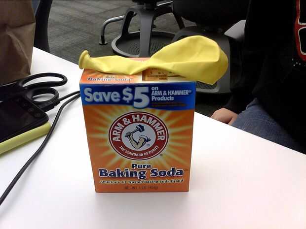 Tomar el balón y llenar con relleno de soda de hornear alrededor de la mitad del globo.