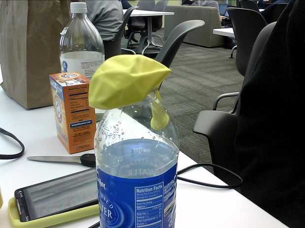 El balón encima de la tapa de la botella de agua y la soda para hornear de la gota en la botella.