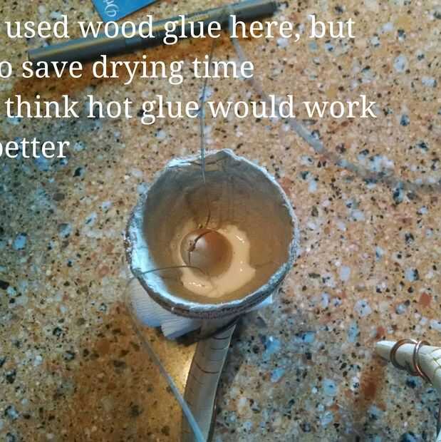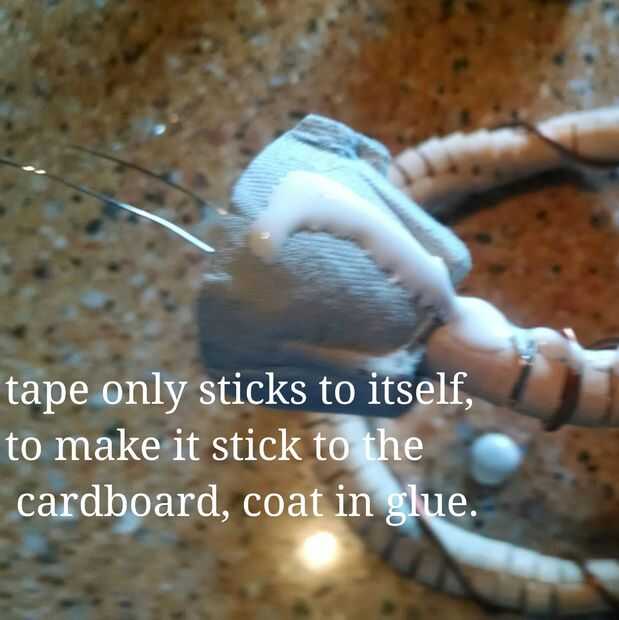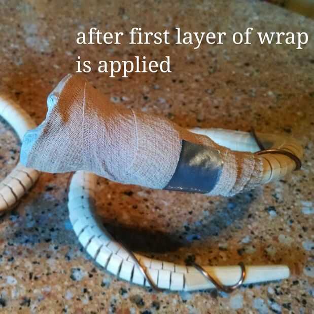parte de campana necesita estar seguro a la madera antes de empezar con la envoltura de la cinta o que resbale todo. Usé pegamento de madera en este, pero tomó un tiempo para secar, así que le sugiere el uso de pegamento caliente. Esta cinta se pega sólo a sí mismo, por lo que necesita la cola cubierta en la cartulina antes de comenzar a añadir la capa de base. pegamento caliente no funcionaría para esto porque sentaría demasiado rápido. la cinta que se muestra es algo que tenía que poner alrededor, era un poco viejo y no quería seguir así, ahí quedaría el pedacito de cinta para asegurarse de que. Conseguí 1 rollo de los blancos, pero sólo porque también tenía lo amarillento. comprar 2 de los blancos, sólo necesita uno de la roja, naranja y amarillo. el material coloreado se hace para envolturas animales vendaje, lo conseguí en la tienda de la granja. también es en línea.