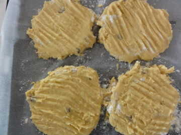 Cucharadas de masa sobre la bandeja para hornear preparada. Poner la harina sobre la masa y aplanar con un tenedor.