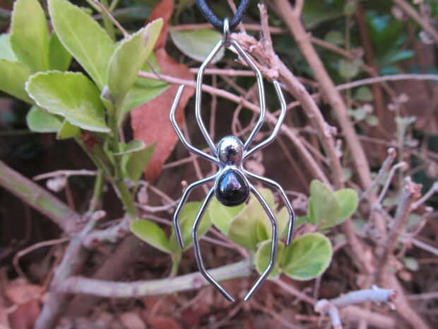 Aquí está mi diseño para un colgante de araña de piedra y alambreHerramientasCuchillas laterales.ronda de alicates.Pequeño archivo plano para rebordear o similar,Materiales1 grande grano de unos 2 cm de tamaño.1 menor grano alrededor de 1 cm de tamañ