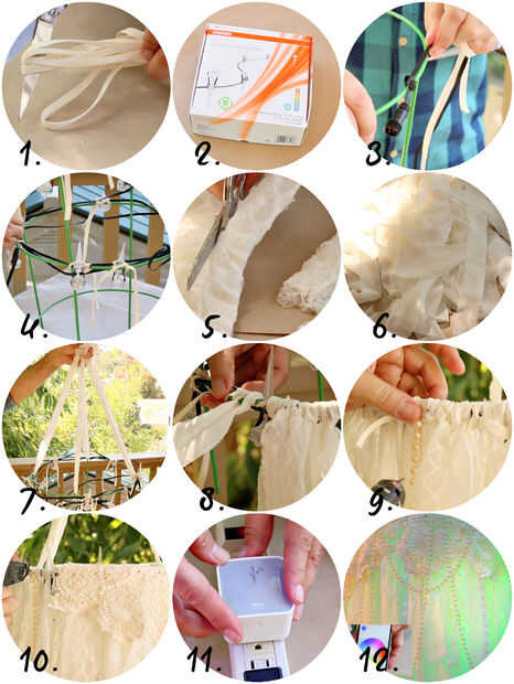9. Cubra y caliente pegamento hilos de perlas, cinta y cordón por el anillo superior de la lámpara