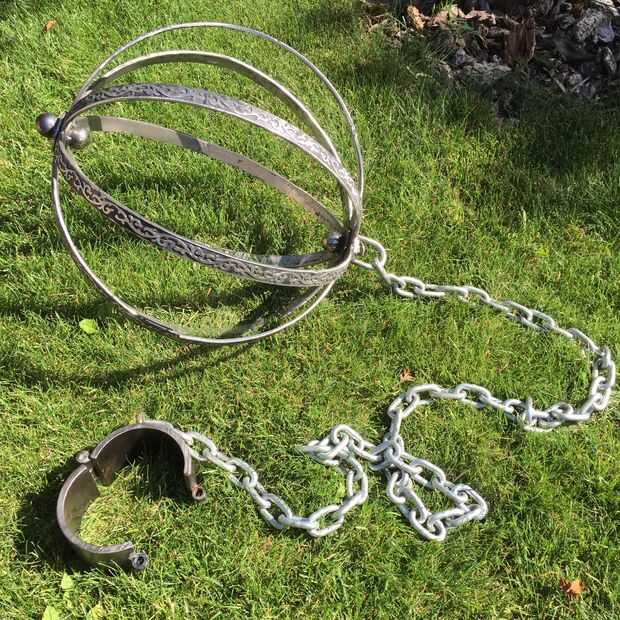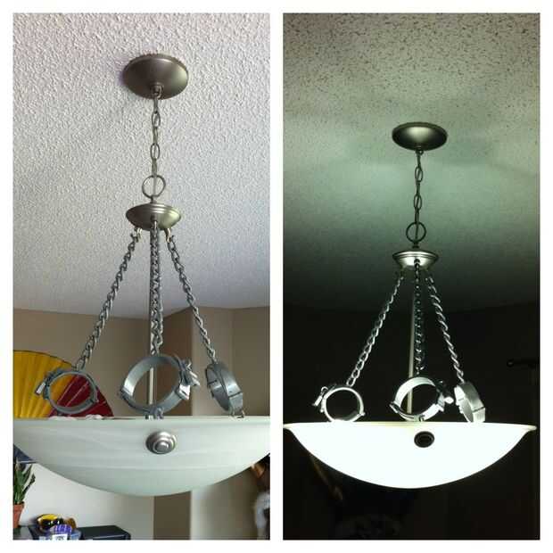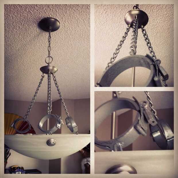 usé tres grilletes para reemplazar los postes poco que mantienen mi tono claro. Para ello tuve que soldar pequeños ganchos en el lado opuesto del grillete luego la cadena. A continuación, conectarse a través de la sombra. Encender las luces y tienes lámpara de arco medieval.