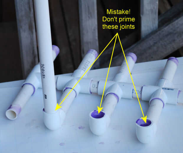 Utilizando la cartilla/pegamento para PVC, pegamento 1 x 5 pulgadas del puntal en cada lado de la "T" de PVC fitting y segmento de 1 x 3 pulgadas en el centro de la "T"