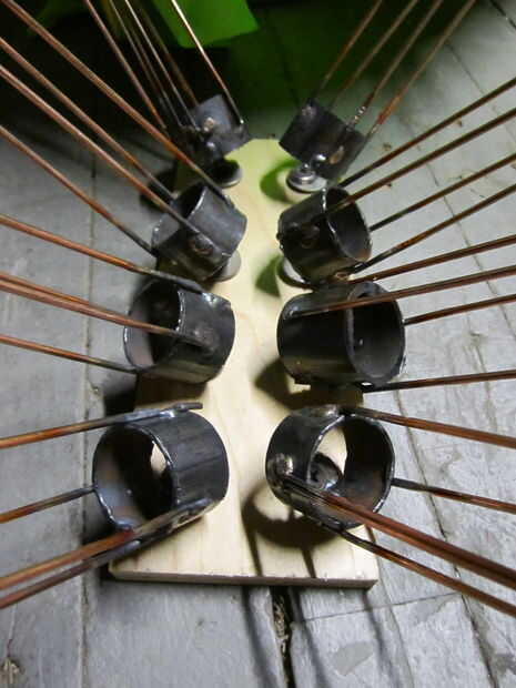 Arandelas soldadas a los extremos de las patas y luego se enrosca en una placa de madera.
