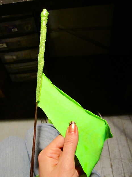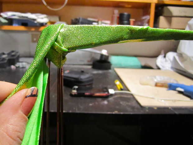 Envolver las piernas con spandex. Pegamento del spandex con pegamento caliente