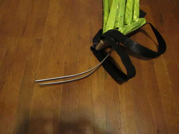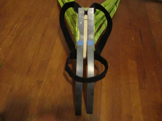 Toma 2 piezas de metal y formar en una curva la parte de atrás y sujete a la tablita de madera que se atornillan las patas en. Luego realizar un arnés de tiras de Velcro.